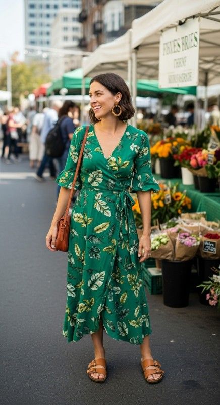 Make a statement at your next weekend gathering with an emerald green wrap dress adorned with tropical botanical prints. The vibrant pattern celebrates nature’s beauty while the wrap style ensures all-day comfort during extended social events. Complement the look with tan leather sandals and a structured crossbody bag in cognac brown. Bamboo hoop earrings add an earthy, sustainable touch to your accessories. This eye-catching piece works wonderfully for outdoor markets, plant nursery visits, or eco-friendly fashion events. The bold print sparks conversation while the comfortable fit keeps you at ease.