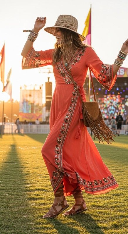 Embrace free-spirited summer energy with a coral orange wrap dress featuring bohemian-inspired embroidery along the neckline and hem. The flowing maxi length moves beautifully as you dance at outdoor music festivals or art fairs. Style with cognac leather gladiator sandals and a fringed suede crossbody bag for authentic boho flair. Layer beaded bracelets and a floppy wide-brim hat to protect from the sun in style. This vibrant look captures the essence of carefree summer adventures and creative expression. The breathable cotton blend fabric keeps you comfortable during long days of exploration.