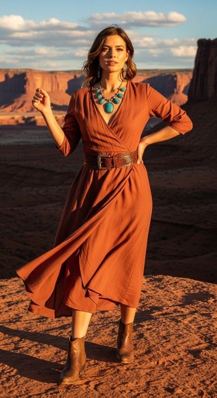 Connect with nature’s palette in a warm terracotta wrap dress that complements desert landscapes and southwestern aesthetics. The earthy hue pairs beautifully with natural textures and artisan-crafted accessories for an authentic, grounded look. Brown leather ankle boots and a tooled leather belt add rustic charm to this versatile outfit. Turquoise and silver statement jewelry honors indigenous artistry while adding vibrant contrast. This look works wonderfully for gallery openings, cultural festivals, or scenic road trips through canyon country. The rich color deepens beautifully in golden hour photography.