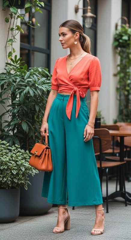 Why It Works: Teal and coral are a sophisticated color pairing that’s both vibrant and wearable. Wide-leg teal culottes provide structure and movement, while a coral crop top adds warmth and youthfulness. It’s polished enough for work but fun enough for weekends.