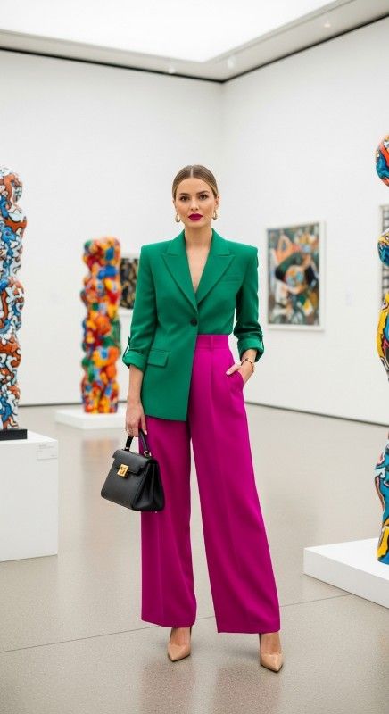 Why It Works: Emerald and fuchsia are jewel tones that create luxurious vibrancy. This combination is bold enough to turn heads but sophisticated enough for important occasions. The structured blazer balances the flowing trousers for perfect proportion.