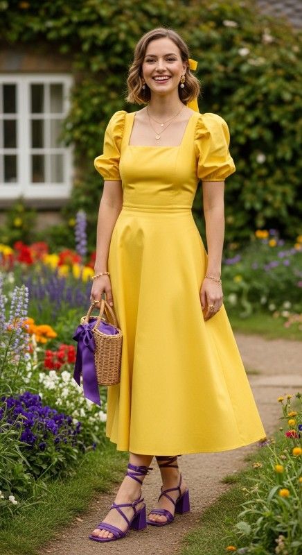 Why It Works: Yellow is the color of optimism, and paired with purple accessories, it creates a regal, cheerful combination. This sunny midi dress is flattering and feminine, while purple sandals add unexpected sophistication.