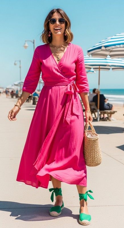Why It Works: Hot pink is bold and unapologetic, while green espadrilles add a fresh, natural contrast. This wrap dress is universally flattering and the green accessories ground the brightness perfectly.