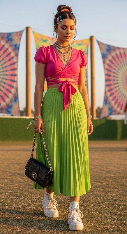 Why It Works: Fuchsia is bold and feminine, while green adds freshness and balance. This high-waisted wide-leg silhouette is flattering and dramatic, while the green crop top keeps it youthful and fresh.