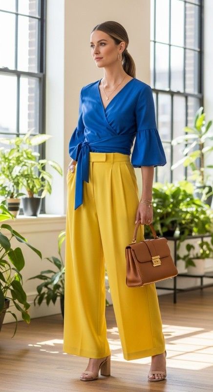 18. Cobalt Wrap Top with Yellow Wide-Leg Pants