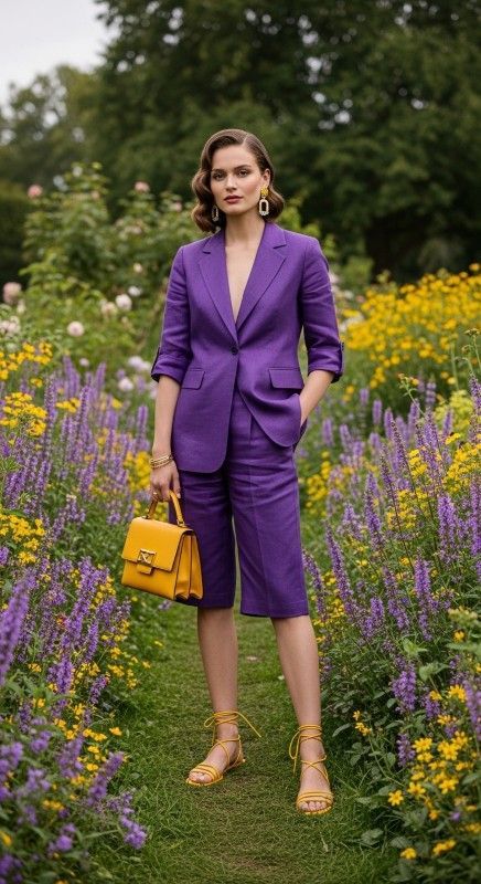 Why It Works: Purple is regal and mysterious, while yellow adds sunshine and joy. This matching linen set is polished and breathable, while yellow sandals create a cheerful, complementary finish.