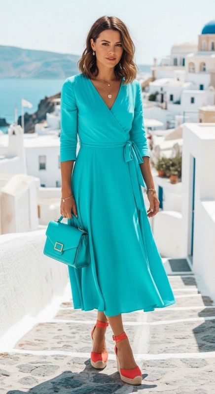 Why It Works: Turquoise is refreshing and coastal, while coral adds warmth and energy. This wrap dress is universally flattering and the coral wedges create a perfect complementary pop.