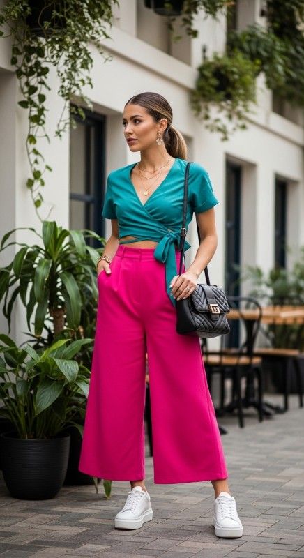 Why It Works: Hot pink is bold and unapologetic, while teal adds cool sophistication. These wide-leg culottes are comfortable and chic, while the teal crop top creates a fresh, complementary pairing.