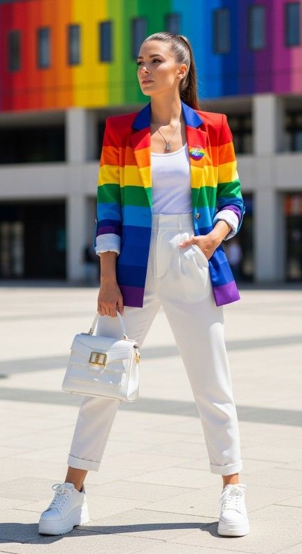 Why It Works: A rainbow-striped blazer is the ultimate statement piece, and pairing it with all-white creates the perfect canvas for the colors to shine. This combination is playful yet polished, bold yet balanced.