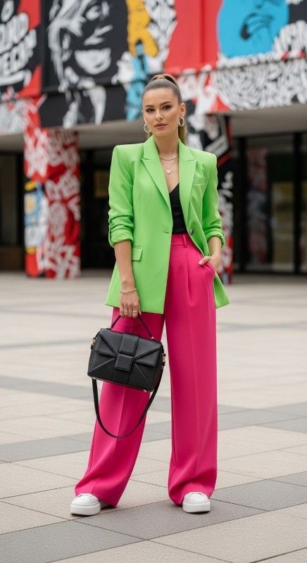 Why It Works: This fearless combination embraces neon saturation head-on. A structured neon green blazer paired with hot pink wide-leg trousers creates an electric, fashion-forward look that commands attention. The key is keeping the silhouette clean and letting the colors do the talking.