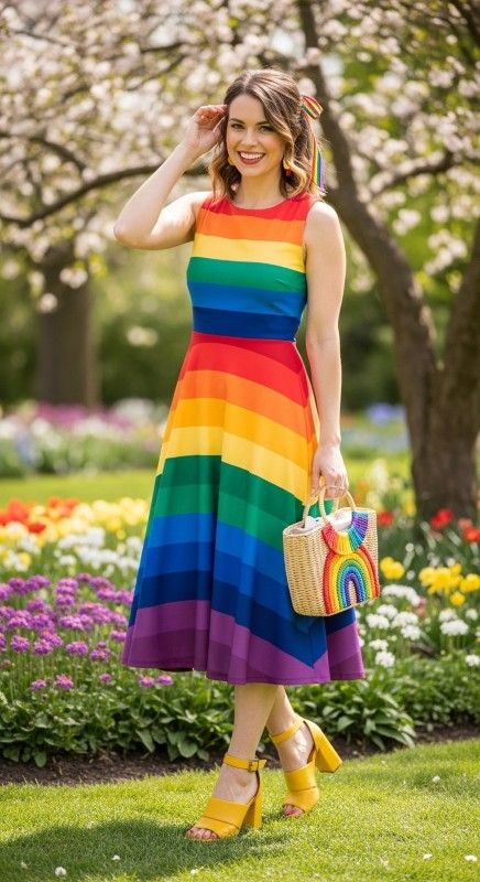 Why It Works: A rainbow-striped midi dress is pure joy in fabric form. The horizontal stripes in red, orange, yellow, green, blue, and purple create playful movement, while bright yellow sandals pick up one stripe for a cohesive finish. It’s whimsical, optimistic, and impossible not to smile at.