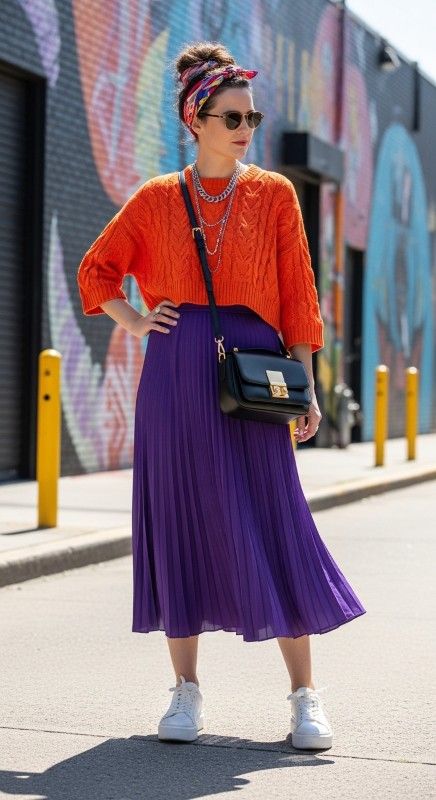 Why It Works: Orange and purple are complementary colors that create stunning visual impact. A lightweight orange cropped sweater paired with a flowing purple midi skirt balances cozy texture with romantic movement. It’s unexpected, artistic, and wonderfully wearable.