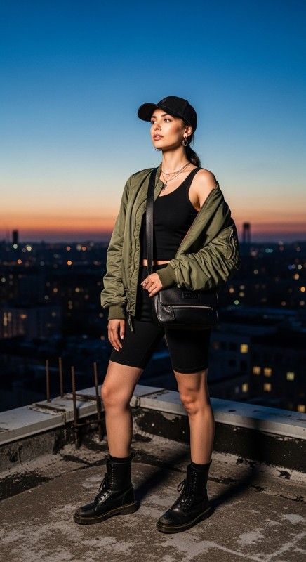 An olive green bomber jacket paired with black biker shorts creates utilitarian chic perfect for transitional summer evenings. The lightweight bomber adds edge and versatility while the fitted shorts ensure comfortable movement. Style with black combat boots and a crossbody bag for edgy practicality. Add a baseball cap and minimal jewelry for sporty refinement. This combination balances tough and feminine beautifully. Ideal for concerts, festivals, or casual urban exploration.