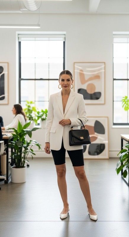 A crisp white blazer paired with black biker shorts creates striking contrast perfect for smart-casual summer occasions and creative workplaces. The structured blazer adds authority while the athletic shorts provide comfortable breathability. Style with white pointed-toe flats and a structured mini bag for polished modernity. Add gold hoops and a sleek bun for refined simplicity. This combination proves professionalism can be contemporary and comfortable. Ideal for creative industries or casual business settings.