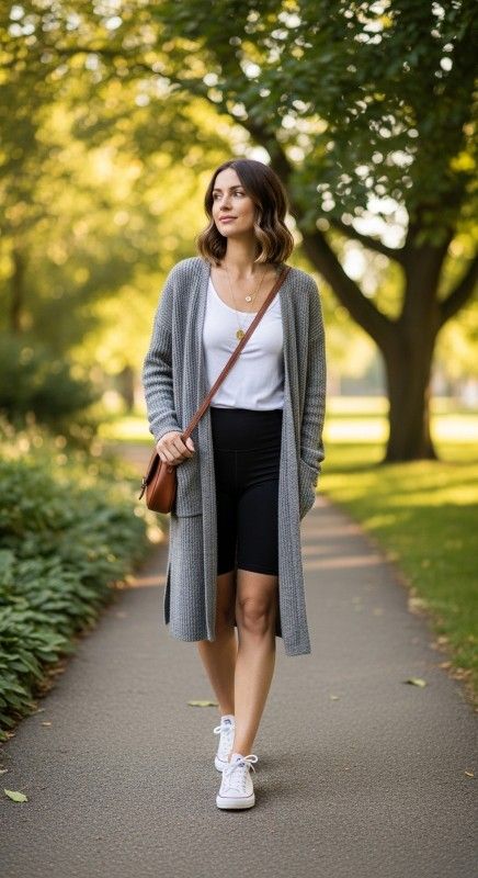 A longline gray cardigan draped over a tank with black biker shorts creates cozy sophistication perfect for cooler summer evenings or air-conditioned spaces. The flowing cardigan adds coverage and elegance while the fitted shorts ensure comfortable movement. Style with white sneakers and a crossbody bag for practical everyday style. Add delicate jewelry and natural waves for relaxed refinement. This combination balances comfort with polished appeal seamlessly. Ideal for travel, errands, or casual outings.
