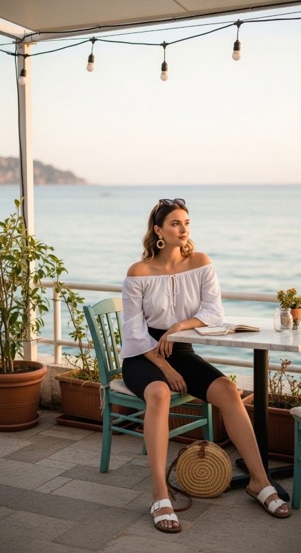 A white off-shoulder top paired with black biker shorts creates romantic athleticism perfect for casual summer dates or weekend brunches. The feminine neckline adds softness while the fitted shorts provide comfortable movement and breathability. Style with white sandals and a woven bag for relaxed elegance. Add hoop earrings and loose waves for beachy refinement. This combination balances pretty and practical seamlessly. Ideal for coastal towns, cafรฉs, or casual gatherings.