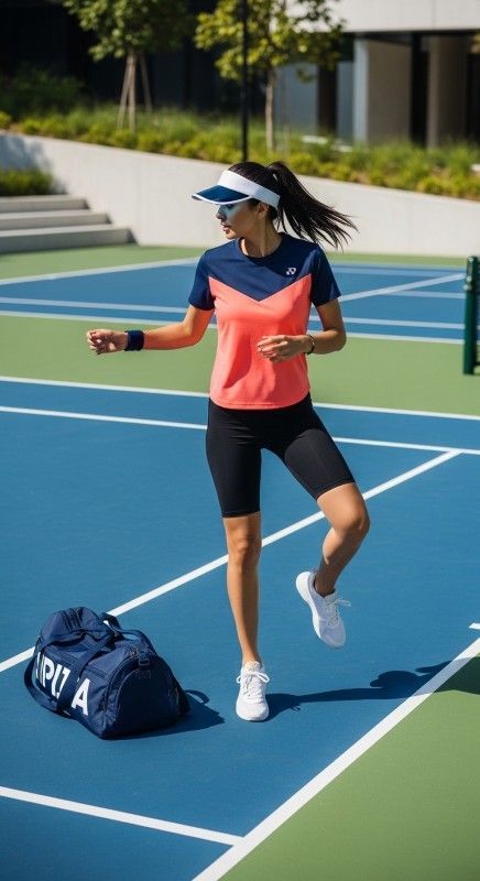 A vibrant color block top in coral and navy paired with black biker shorts creates energetic style perfect for athletic activities or casual summer days. The bold colors add visual interest while the neutral shorts ground the look with sophistication. Style with white sneakers and a sports bag for functional fashion. Add a visor and minimal jewelry for sporty polish. This combination celebrates confidence and comfort equally. Ideal for workouts, tennis, or active weekends.