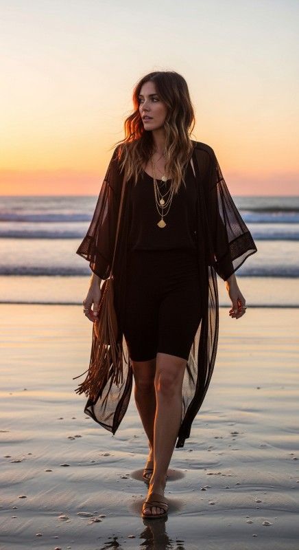 A black sheer kimono layered over a tank with black biker shorts creates bohemian elegance perfect for beach days or casual summer evenings. The flowing kimono adds coverage and movement while the fitted pieces underneath ensure comfort and support. Style with flat sandals and a fringe bag for relaxed boho style. Add layered necklaces and beachy waves for free-spirited refinement. This combination celebrates effortless grace with artistic flair. Ideal for beach clubs, festivals, or sunset gatherings.