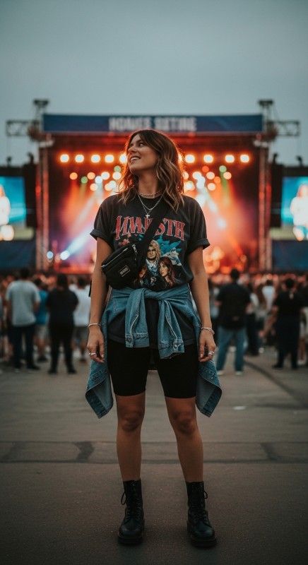 A vintage band tee tucked into black biker shorts creates nostalgic cool perfect for concerts and casual summer adventures. The graphic print adds personality while the fitted shorts provide comfortable movement and breathability. Style with combat boots or sneakers and a crossbody bag for edgy practicality. Add a denim jacket and minimal jewelry for layered refinement. This combination celebrates music culture with contemporary style. Ideal for concerts, festivals, or casual hangouts.