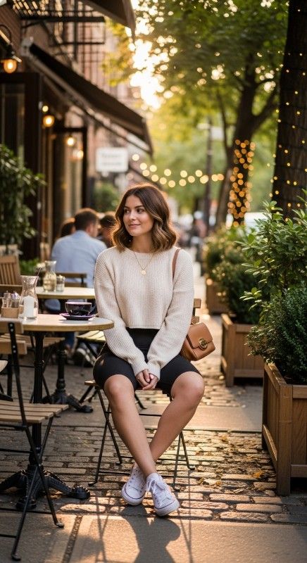 A cream cropped sweater paired with black biker shorts creates cozy contrast perfect for cooler summer evenings or transitional weather. The soft knit adds warmth and texture while the fitted shorts ensure comfortable movement and breathability. Style with white sneakers and a mini bag for casual elegance. Add delicate jewelry and natural waves for relaxed refinement. This combination balances comfort with contemporary style beautifully. Ideal for casual dates, coffee runs, or weekend errands.