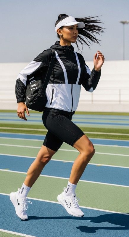 A black and white athletic jacket paired with black biker shorts creates coordinated sporty elegance perfect for workouts or athleisure styling. The matching set provides a streamlined silhouette while the breathable fabric ensures comfort during activity. Style with white running shoes and a sports bag for functional fashion. Add a visor and minimal jewelry for polished athletic appeal. This combination celebrates performance with style seamlessly. Ideal for running, gym sessions, or active weekends.