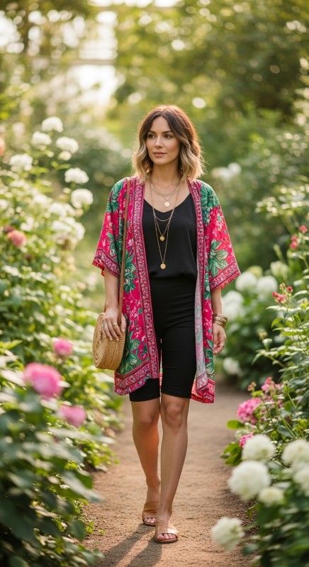 A vibrant floral kimono in pinks and greens layered over a tank with black biker shorts creates bohemian romance perfect for summer festivals or beach days. The flowing kimono adds artistic flair and coverage while the fitted pieces underneath ensure comfortable movement. Style with flat sandals and a woven bag for relaxed boho elegance. Add layered jewelry and loose waves for free-spirited refinement. This combination celebrates nature’s beauty with effortless grace. Ideal for garden parties, festivals, or sunset gatherings.