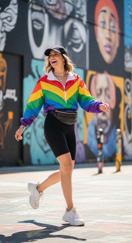 A vibrant rainbow windbreaker paired with black biker shorts creates playful energy perfect for active summer days or casual street style. The colorful jacket adds personality and weather protection while the fitted shorts ensure comfortable movement and breathability. Style with white sneakers and a belt bag for sporty functionality. Add a baseball cap and minimal jewelry for polished casual appeal. This combination celebrates joy and movement equally. Ideal for outdoor activities, festivals, or casual adventures.