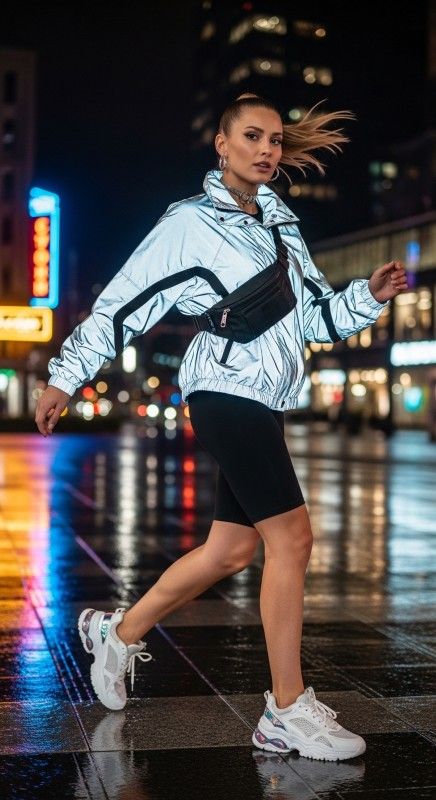 A silver reflective jacket paired with black biker shorts creates futuristic athleisure perfect for evening workouts or edgy street style. The metallic fabric catches light beautifully while the fitted shorts ensure comfortable movement and breathability. Style with chunky white sneakers and a belt bag for sporty functionality. Add minimal jewelry and a sleek ponytail for polished modern appeal. This combination celebrates innovation with athletic confidence. Ideal for night runs, dance classes, or urban adventures.