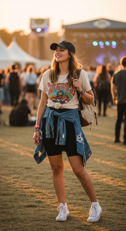 A vintage graphic tee tucked into black biker shorts creates nostalgic cool perfect for casual summer days and weekend adventures. The relaxed tee balances the fitted shorts while the graphic adds personality and visual interest. Pair with white high-top sneakers and a baseball cap for sporty street style. Layer a denim jacket and add a backpack for practical exploration. This look celebrates effortless comfort with retro vibes. Perfect for concerts, markets, or casual hangouts.