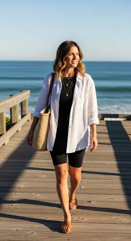 An oversized white button-down shirt worn open over a tank with black biker shorts creates layered sophistication for warm summer days. The flowing shirt provides coverage while allowing airflow, and the biker shorts ensure comfortable movement. Tie the shirt at the waist for definition and add tan sandals for relaxed elegance. Layer delicate necklaces and wear hair in loose waves for beachy refinement. This look transitions seamlessly from beach to cafรฉ. Ideal for coastal towns or casual outings.