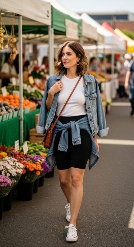 A white ribbed tank top with black biker shorts layered under a light-wash denim jacket creates classic casual cool for variable summer weather. The denim jacket adds structure and versatility while the tank and shorts provide breathable comfort. Pair with white sneakers and a crossbody bag for effortless everyday style. Add hoop earrings and natural waves for relaxed polish. This timeless combination works for countless casual occasions. Ideal for shopping, brunch, or casual dates.