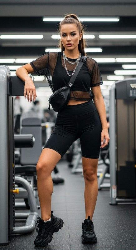 A black mesh overlay top worn over a sports bra with black biker shorts creates edgy athleisure perfect for gym sessions or street style. The sheer mesh adds dimension and attitude while the fitted pieces underneath ensure support and coverage. Style with chunky sneakers and a belt bag for sporty functionality. Layer silver chains and wear hair in a high ponytail for fierce refinement. This look celebrates athletic confidence with fashion-forward edge. Ideal for workouts, dance classes, or urban adventures.