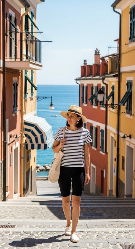 A navy and white striped tee tucked into black biker shorts creates nautical-inspired casual elegance perfect for coastal summer days. The classic stripes add visual interest while the fitted shorts provide comfortable movement and breathability. Pair with white espadrilles and a canvas tote for relaxed seaside style. Add a straw hat and simple studs for sun-smart polish. This combination captures effortless maritime charm. Ideal for beach towns, boardwalks, or casual cafรฉs.