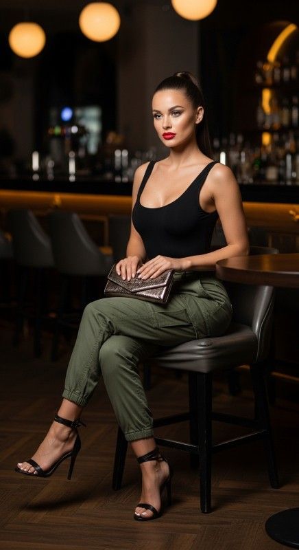 Sleek olive cargo pants styled with a black bodysuit and strappy heels create elevated edge perfect for nights out and dinner parties. The fitted bodysuit balances the relaxed cargo silhouette for modern sophistication. Add a leather jacket and metallic clutch for complete evening glamour. Finish with bold lips and sleek hair for confident allure. This look transforms utility pants into statement evening wear. Ideal for cocktail bars, date nights, or special celebrations.