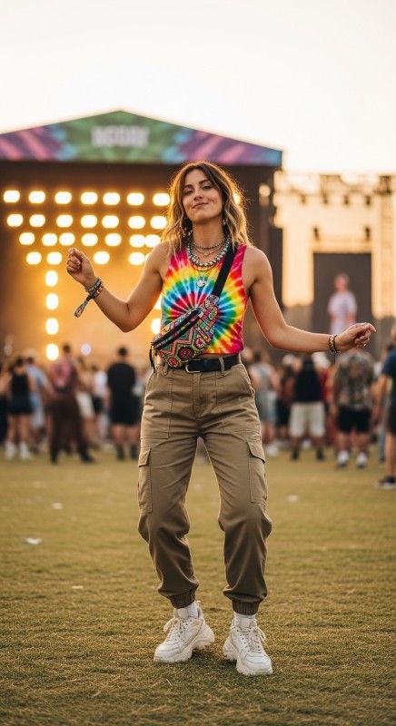 Relaxed khaki cargo pants paired with a vibrant tie-dye tank create playful energy perfect for festivals and casual summer days. The colorful tank adds artistic flair while the cargo pants provide practical comfort. Style with chunky sneakers and a fanny pack for hands-free fun. Add layered necklaces and beachy waves for free-spirited refinement. This combination celebrates creativity with functional fashion. Ideal for outdoor concerts, beach days, or weekend adventures.