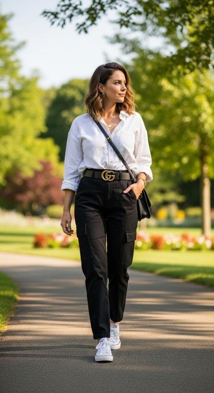Classic black cargo pants styled with an oversized white shirt and statement belt create timeless utility perfect for everyday wear and casual sophistication. The belt cinches the waist for definition while maintaining the relaxed cargo aesthetic. Pair with white sneakers and a crossbody for effortless versatility. Add minimal jewelry and natural waves for polished casual appeal. This look proves simplicity can be incredibly stylish. Ideal for errands, coffee dates, or casual Fridays.