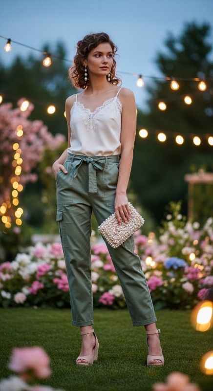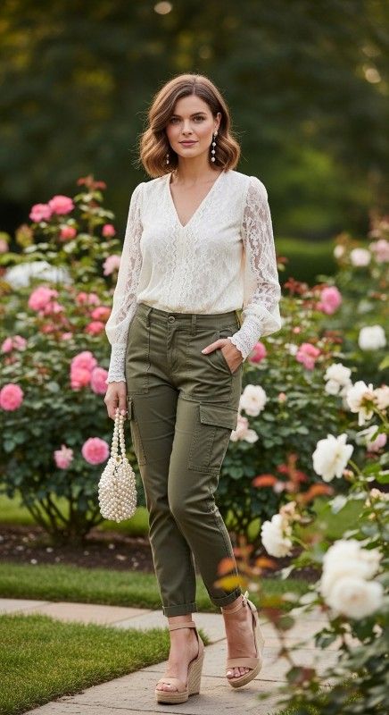 Classic olive cargo pants paired with an ivory lace blouse create romantic utility perfect for garden parties and feminine summer occasions. The delicate lace softens the tactical pants for balanced elegance. Style with nude wedges and a pearl-embellished bag for refined femininity. Add pearl jewelry and soft waves for romantic finishing touches. This combination celebrates duality with graceful sophistication. Ideal for bridal showers, afternoon teas, or garden celebrations.