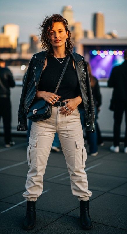 Soft cream cargo pants styled with a black tank and leather jacket create edgy contrast perfect for summer evenings and transitional weather. The leather adds toughness while the light cargo pants keep the look fresh. Pair with ankle boots and a crossbody for versatile edge. Add silver jewelry and messy waves for rock-chic refinement. This combination celebrates rebellion with modern sophistication. Ideal for concerts, nights out, or urban adventures.