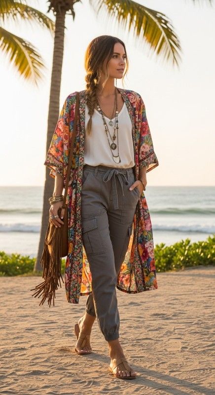 Cool grey cargo pants paired with a vibrant floral kimono create bohemian layering perfect for summer festivals and outdoor gatherings. The flowing kimono adds romantic movement while the cargo pants provide practical structure. Style with flat sandals and a fringe bag for free-spirited elegance. Add layered necklaces and loose braids for authentic boho charm. This combination celebrates artistic expression with functional fashion. Ideal for beach parties, markets, or sunset celebrations.