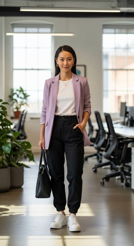 Edgy black cargo pants paired with a soft lavender blazer create unexpected contrast perfect for creative workplaces and modern professional settings. The pastel blazer softens the tactical pants for contemporary sophistication. Style with white sneakers and a structured bag for versatile elegance. Add minimal jewelry and sleek hair for polished appeal. This look proves cargo pants can be boardroom-ready with the right styling. Ideal for creative industries, meetings, or presentations.