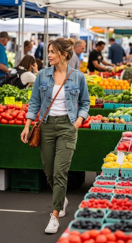Classic olive cargo pants paired with a crisp white tank and light-wash denim jacket create the perfect casual summer ensemble for weekend adventures. The relaxed fit of the cargo pants provides comfort while the denim jacket adds structure for variable temperatures. Style with white sneakers and a crossbody bag for hands-free exploration. Add gold hoops and keep hair in a messy bun for effortless cool. This combination balances utility with timeless style beautifully. Ideal for farmers markets, casual brunches, or outdoor festivals.