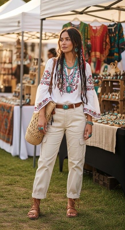 Soft cream cargo pants paired with a white embroidered peasant top create artisanal elegance perfect for cultural events and summer gatherings. The intricate embroidery adds visual richness while the cargo pants provide modern practicality. Style with tan sandals and a woven tote for bohemian refinement. Add turquoise jewelry and loose braids for free-spirited charm. This combination celebrates craftsmanship with contemporary style. Ideal for markets, festivals, or outdoor celebrations.