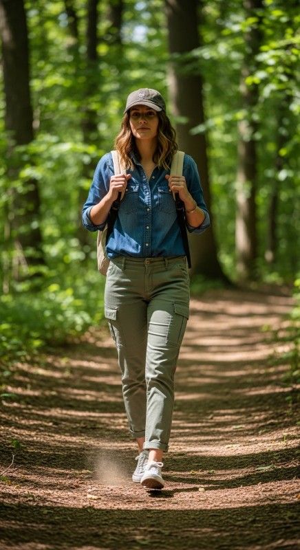 Soft sage cargo pants styled with a chambray denim shirt create double-denim vibes perfect for casual summer days and outdoor adventures. The monochromatic blue-green palette is effortlessly cool and cohesive. Tie the shirt at the waist for definition and add white sneakers for sporty ease. Finish with a baseball cap and natural waves for relaxed refinement. This combination celebrates comfort with laid-back style. Ideal for hiking, markets, or weekend exploration.