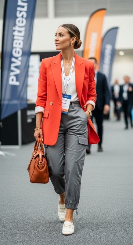 Cool grey cargo pants styled with a vibrant coral blazer create bold contrast perfect for creative workplaces and confident professionals. The bright blazer energizes the neutral cargo pants for statement-making style. Pair with white loafers and a structured bag for polished versatility. Add gold jewelry and sleek hair for modern elegance. This look celebrates fearlessness with functional fashion. Ideal for presentations, networking events, or creative meetings.