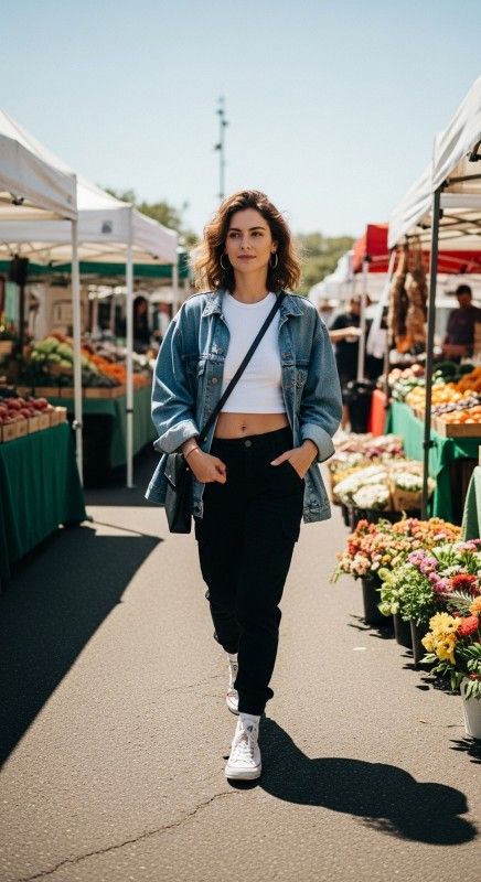 Edgy black cargo pants styled with a white crop top and oversized denim jacket create layered casual cool perfect for weekends and outdoor adventures. The denim adds structure while the crop top provides breathable comfort. Pair with white sneakers and a crossbody for hands-free ease. Add hoop earrings and natural waves for relaxed refinement. This combination celebrates effortless style with functional fashion. Ideal for markets, concerts, or casual hangouts.