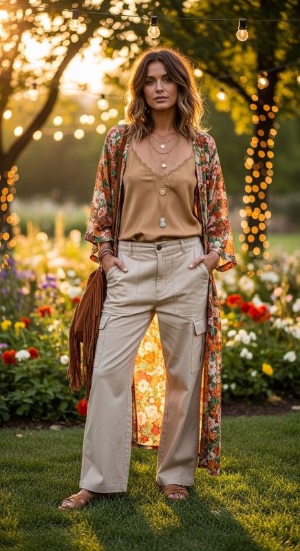 Flowing beige cargo pants paired with a silk camisole and floral kimono create bohemian elegance perfect for summer evenings and outdoor gatherings. The lightweight kimono adds romantic movement while the cargo pants ground the look with practicality. Style with flat sandals and a fringe bag for free-spirited refinement. Add layered necklaces and beachy waves for effortless boho charm. This combination balances femininity with utility beautifully. Ideal for garden parties, sunset dinners, or beach bonfires.
