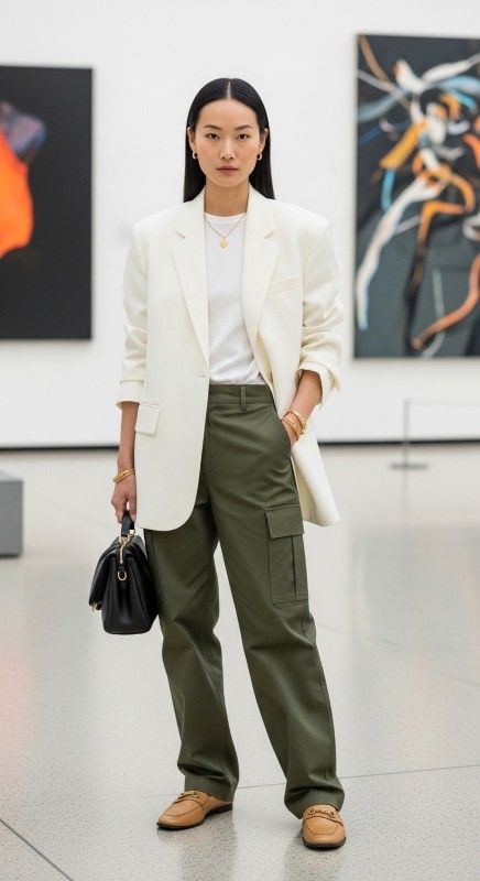 Crisp army green cargo pants styled with an oversized white blazer and tank create polished utility perfect for smart-casual summer occasions. The contrasting colors create visual interest while maintaining professional sophistication. Pair with loafers and a structured bag for refined versatility. Add minimal jewelry and sleek hair for modern elegance. This look transforms tactical pants into contemporary power dressing. Perfect for creative meetings, gallery openings, or upscale casual events.