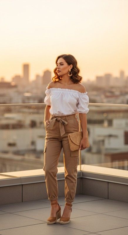 Warm tan cargo pants paired with a white off-shoulder top create romantic utility ideal for summer dates and casual elegance. The feminine neckline softens the tactical silhouette for balanced styling. Style with espadrille wedges and a woven clutch for elevated casual appeal. Add hoop earrings and soft curls for romantic refinement. This combination proves cargo pants can be date-night appropriate. Perfect for outdoor dinners, sunset cocktails, or weekend getaways.