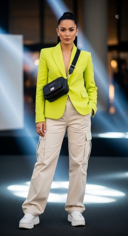 Soft cream cargo pants styled with a vibrant neon yellow blazer create bold contrast perfect for making a statement at summer events and creative gatherings. The bright blazer energizes the neutral cargo pants for eye-catching style. Pair with white sneakers and a mini bag for modern edge. Add minimal jewelry and sleek hair for polished confidence. This look celebrates fearlessness with functional fashion. Ideal for fashion events, parties, or creative workplaces.