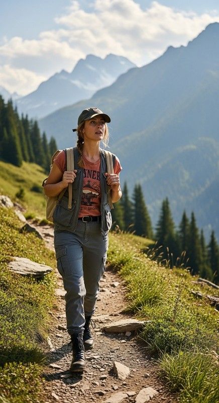 Cool grey cargo pants styled with a vintage graphic tee and utility vest create layered street style perfect for festivals and outdoor adventures. The vest adds functional pockets while the graphic tee provides personality. Pair with combat boots and a backpack for hands-free exploration. Add a baseball cap and minimal jewelry for sporty edge. This look celebrates practicality with urban attitude. Ideal for hiking, music festivals, or casual city exploration.